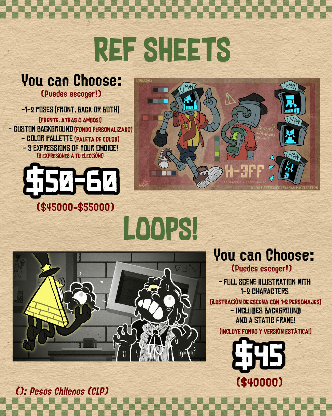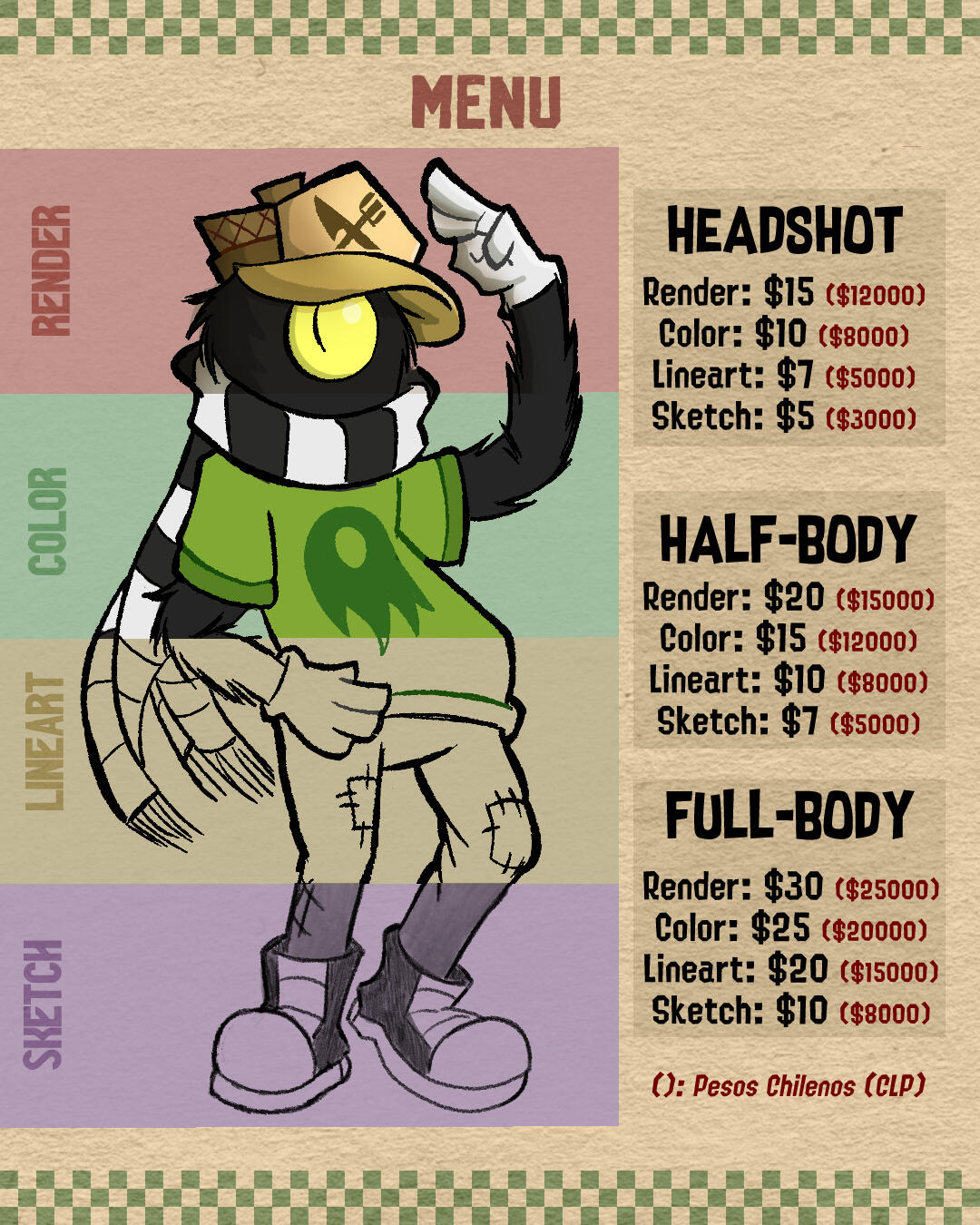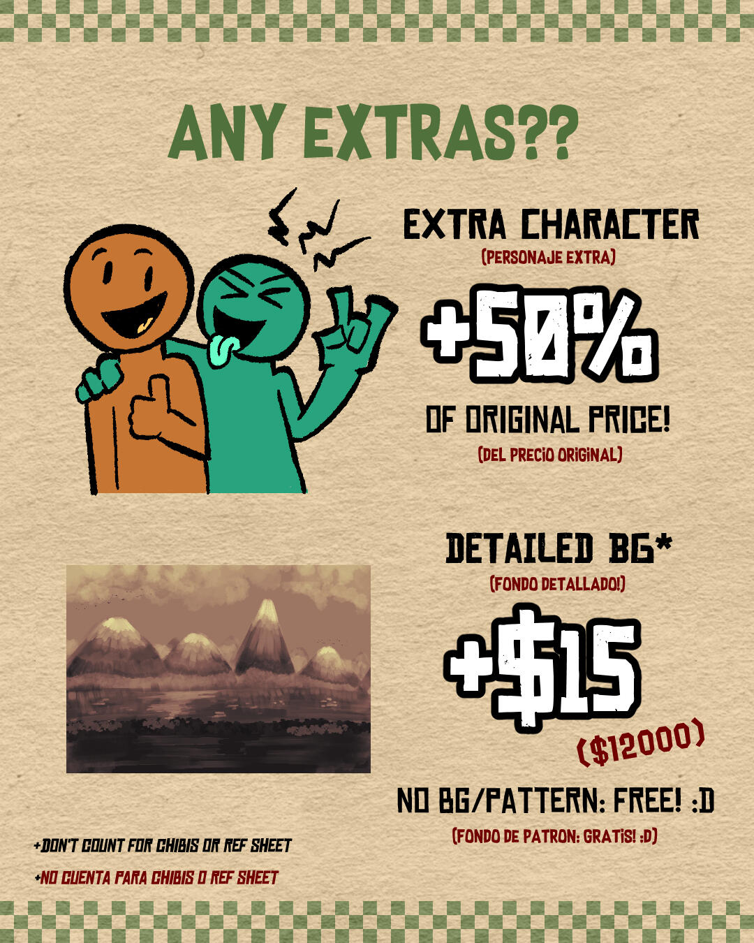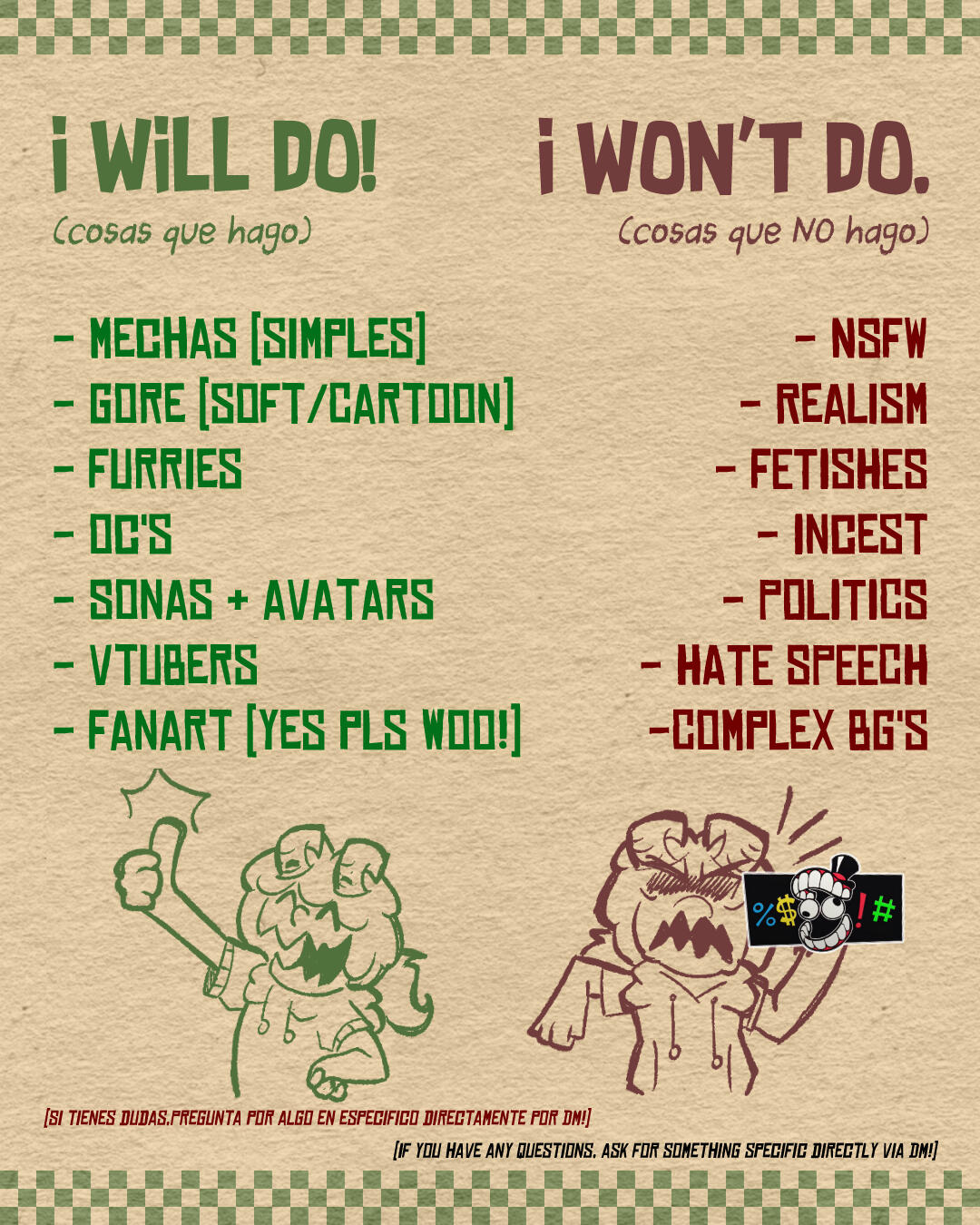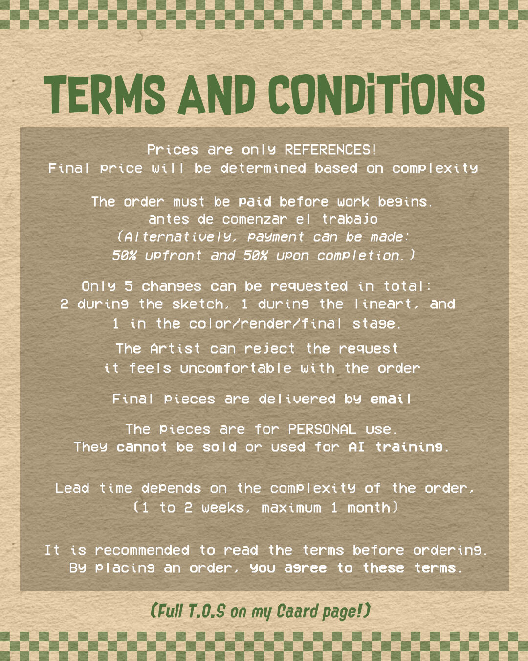 Al pedir la pieza, se le pedirá al cliente que sea lo más claro, específico y detallado posible para describir su idea (ej. Descripción de la escena, personalidad de los personajes, etc), para evitar malentendidos con el artista.